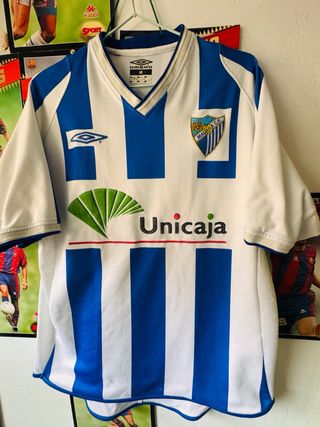 Camiseta de fútbol del Málaga CF, marca Umbro. - Diseño a rayas verticales blancas y azules. - Escudo del club en el pecho. - Logo de Umbro en la manga. - Patrocinador Unicaja en el frontal.