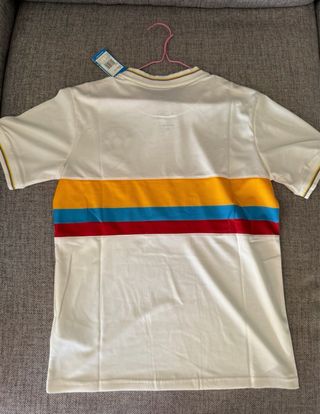 Camiseta conmemorativa de Adidas por los 100 años de Colombia. - Diseño blanco con franjas horizontales. - Detalles de las franjas en amarillo, azul y rojo. - Logo de Adidas bordado. - Escudo conmemorativo del evento.
