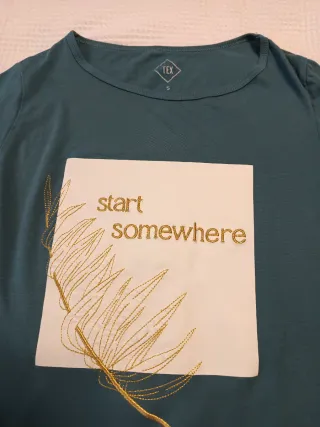 Camiseta de manga larga con un diseño estampado. - Estampado frontal con texto start somewhere y detalle de plumas doradas. - Cuello redondo. - Manga larga. Nunca se ha usado. Medidas: De hombro a hombro 36 cm De sisa a sisa 41 cm Longitud 54 cm