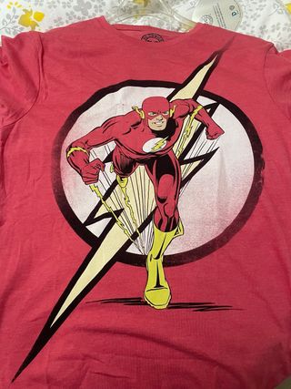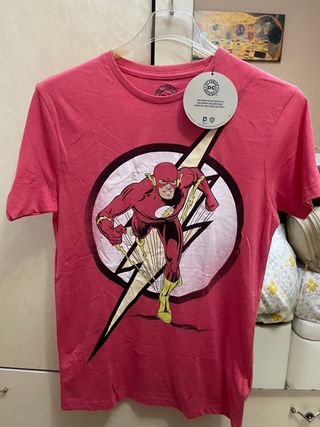 Camiseta oficial de DC Comics con el diseño de The Flash, el superhéroe de DC Cómics. - Estampado del personaje en acción. - Logo de DC Comics en la etiqueta. De sisa a sisa mide 48 cm y el ancho del cuerpo 49 cm, de hombro a hombro 44 y 69 de largo desde el cuello.