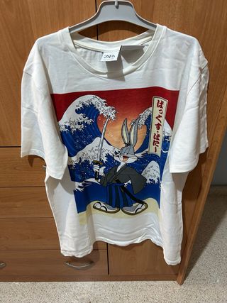 Camiseta blanca de Zara con un diseño inspirado en el arte japonés y Bugs Bunny. - Ilustración de Bugs Bunny con un estilo samurái. - Fondo con olas al estilo de La Gran Ola de Kanagawa. - Kanji en la parte superior derecha. -Usada una vez.