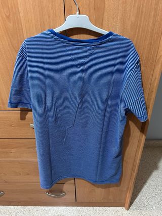 Camiseta de manga corta con un diseño de rayas finas en tonos azules y blancos. Presenta un pequeño logo de la marca en el pecho. - Cuello redondo. - Tejido ligero y cómodo.