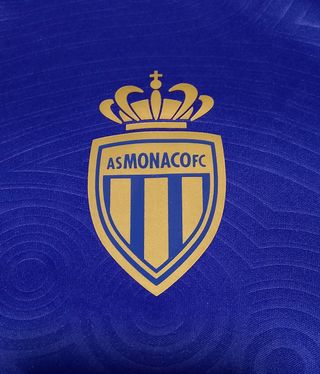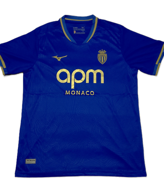 Camiseta del Mónaco. - Color azul con detalles dorados. - Diseño con patrón gráfico. - Logo de Mizuno en el pecho. - Escudo del club en la parte frontal.