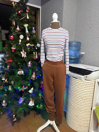 Conjunto de dos camisetas básicas de manga larga y un pantalón. - Camiseta básica color teja, talla S. ( De atmósfera) 3€ - Camiseta con estampado de rayas. (XS , válida para S) primark. 3€ - Pantalón de color marrón. 9€ De Zara talla S y polar por dentro, con puños entallados en los bajos.