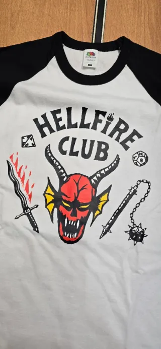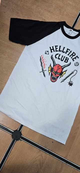 Camiseta de manga raglán con diseño del Hellfire Club. - Diseño frontal con el logo del club y elementos gráficos. - Mangas de color negro y cuerpo blanco.