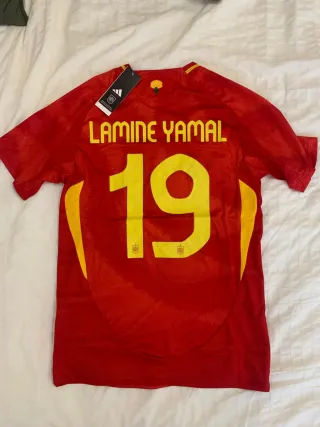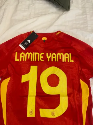 Camiseta de la selección española con el dorsal 19. - Nombre: Lamine Yamal - Número: 19 - Diseño con detalles amarillos - Escudo de la RFEF