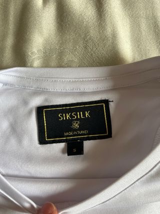 Camiseta de SikSilk con un diseño moderno y deportivo. - Parte superior blanca. - Parte inferior gris. - Detalles de rayas rojas en las mangas. -Se ve un poco arrugada debido a que ha estado guardada mucho tiempo, pero te la planchamos y está perfecta.
