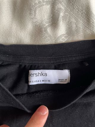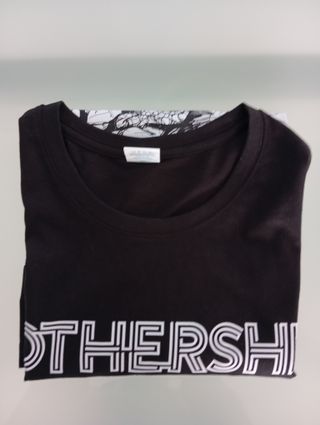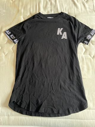 Camiseta negra de Bershka con logo KA. - Diseño moderno. - Detalle de logo KA en blanco en el pecho. - Banda con texto en las mangas. -Se ve arrugada debido a que ha estado guardado mucho tiempo pero te la planchamos y está perfecta.