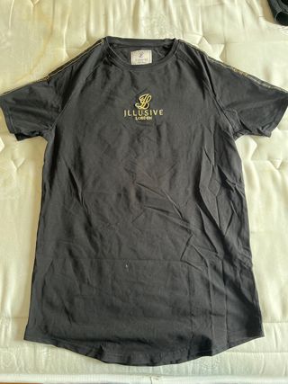 Camiseta de manga corta con detalles dorados. - Logo de Illusive London en el pecho. - Raya dorada en las mangas. -Se ve arrugada porque ha estado guardada mucho tiempo, pero te la planchamos y está perfecta.