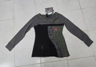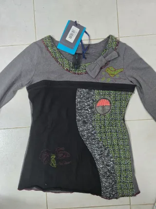 Camiseta de manga larga con un diseño original y moderno. - Cuello redondo con detalle de pedrería. - Lazada decorativa en el cuello. - Estampado frontal con motivos. - Paneles de diferentes texturas y colores.