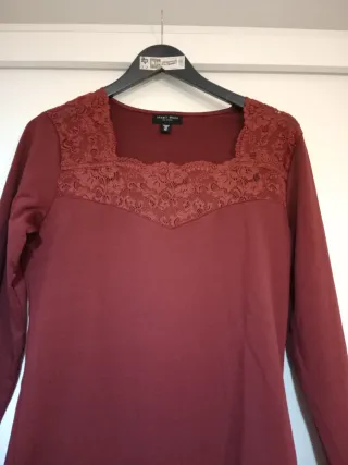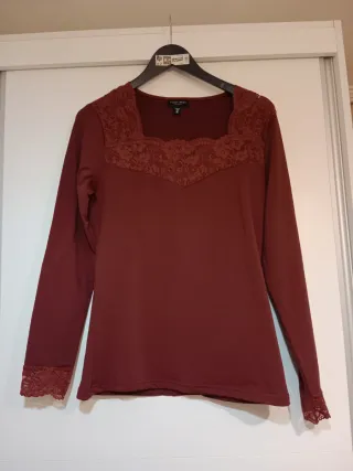 Camiseta de manga larga con detalles de encaje en cuello y puños. Color granate, talla XL - Cuello cuadrado. - Puños con encaje. - Tejido suave y confortable. Ideal como prenda interior y exterior.