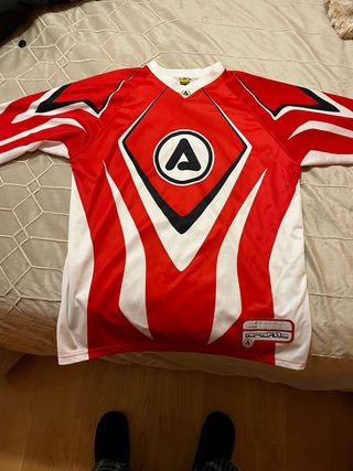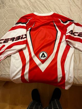 Camiseta de manga larga con un diseño llamativo. - Diseño frontal con logo circular y detalles en negro. - Mangas con detalles en blanco y negro. - Etiqueta de la marca Acerbis en la parte inferior.