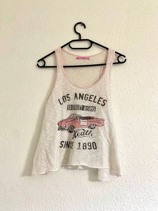 Camiseta de tirantes con estampado de coche vintage y texto. Bershka. - Diseño Los Angeles Bradbury & Sons Heath Since 1890. - Tejido ligero y calado. - Ribete en color rosa en cuello y sisas.