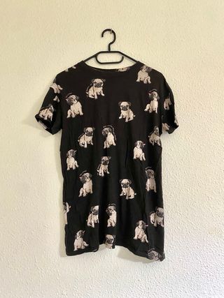 Camiseta negra con estampado de perros Pug de Bershka. Talla XS. Unisex. Beige y negro.