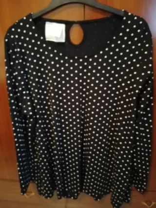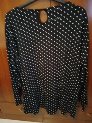 Camiseta de manga larga para mujer con un divertido estampado de corazones. - Material: 100% Algodón. - Diseño: corazones blancos sobre fondo negro. - Cuello redondo con abertura en la espalda. Aunque pone talla XL talla muy grande, medida de axila a axila 62 centímetros