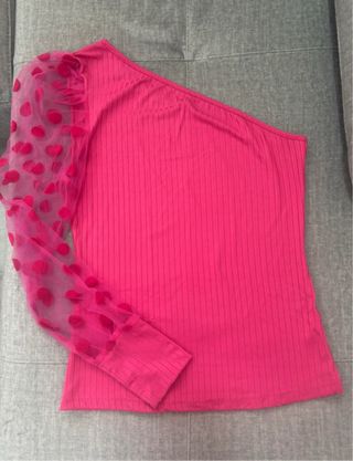 Camiseta con una manga transparente y topos. Color fucsia, puesta una vez.