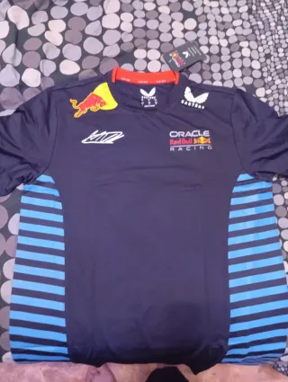 Camiseta oficial del equipo Red Bull Racing. - Diseño con el logo del toro rojo y Oracle. - Paneles laterales a rayas azules. - Cuello y detalles en rojo.