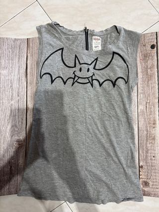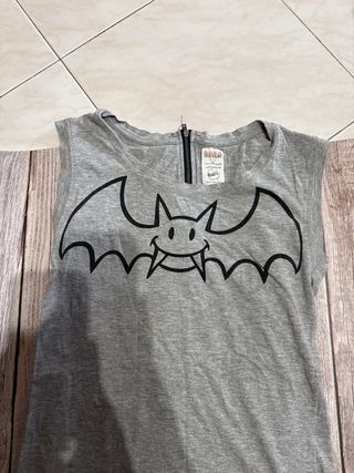 Camiseta sin mangas con un divertido estampado de murciélago sonriente. - Diseño con cremallera en la parte trasera. - Estampado frontal de murciélago. - Cuello redondo.