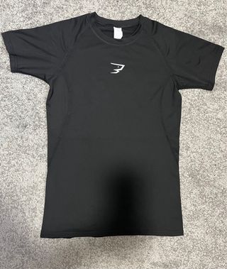 Camiseta de compresión GymShark en color negro. Diseñada para ofrecer soporte y comodidad. - Tejido técnico transpirable. - Costuras ergonómicas para mayor libertad de movimiento. - Logo distintivo en el pecho.