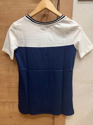 Camiseta manga corta estampada con cuello redondo en colores rojo, blanco y azul. Camiseta talla S con pequeño picado como se aprecia en las fotografías. Solo se realizan envíos 📦.