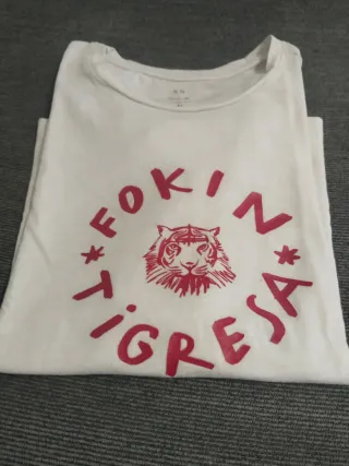 Camiseta blanca con estampado de tigre y texto. - Diseño circular con un tigre en el centro. - Texto Fokin Tigresa rodeando el diseño. - Estampado en color rojo.