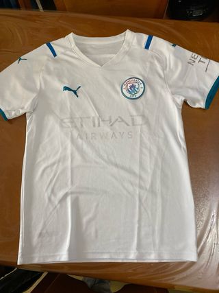 Camiseta oficial del Manchester City. - Diseño moderno en blanco con detalles azules. - Logo del club y patrocinador visibles. - Tejido técnico transpirable.