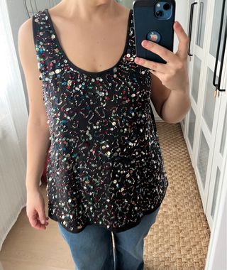 Camiseta con un diseño llamativo de pedrería. - Detalle de cuentas y lentejuelas. - Escote redondo. - Tirantes anchos.