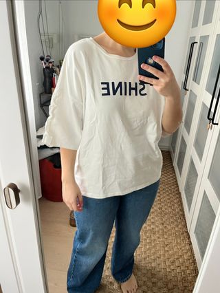 Camiseta blanca con estampado SHINE en contraste. Presenta un diseño de manga tres cuartos. - Cuello redondo. - Corte holgado.