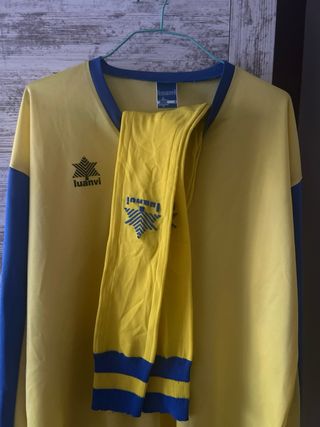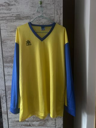 Camiseta de manga larga con cuello en pico y calcetines a juego de la misma marca, se vende todo junto - Diseño bicolor, amarillo y azul - Logo de la marca en el pecho “Luanvi” - No lleva ningun tipo de serigrafía - Talla 7, XL/XLL