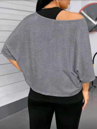 Conjunto de dos camisetas deportivas para mujer, camiseta negra ajustada para ponerla debajo y camiseta amplia en gris para ponerla encima. - Diseño de doble capa. - Mangas amplias tipo murciélago. - Cuello en V. Talla XXL NUEVAS SIN ESTRENAR. Entregas en varias zonas: -MÓSTOLES -CENTRO COMERCIAL XANADÚ -Y PARQUE DEL OESTE (ALCORCÓN) Más artículos en mi perfil...