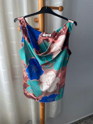 Camiseta sin mangas con un llamativo estampado floral. - Diseño con cuello drapeado. - Tejido satinado. - Estampado de flores en tonos azules, blancos, rosas y marrones.