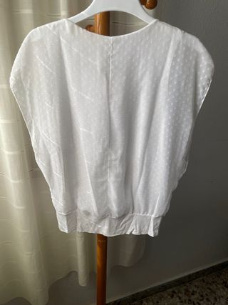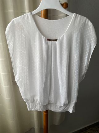 Camiseta sin mangas con un diseño elegante y ligero. Perfecta para añadir un toque sofisticado a tu vestuario. - Tejido con textura de pequeños topos. - Detalle metálico en la parte delantera. - Mangas tipo murciélago. - Bajo elástico.