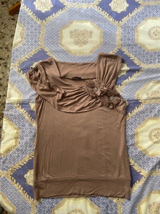 Camiseta sin mangas de color marrón con un diseño original. - Detalle de flores decorativas en el hombro. - Tirante asimétrico. - Escote drapeado.