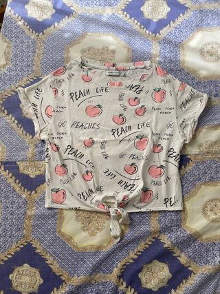 Camiseta corta con estampado divertido de melocotones y la frase Peach Life. - Diseño con nudo delantero. - Estampado repetido de melocotones y texto. - Manga corta.