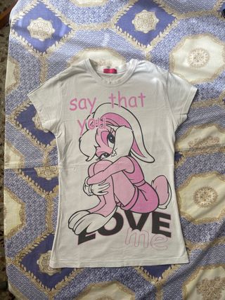 Camiseta blanca de manga corta con un divertido estampado de Lola Bunny. - Diseño frontal con Lola Bunny. - Mensaje Say that you love me en rosa y negro. - Cuello redondo.