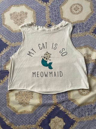 Camiseta sin mangas con un divertido diseño de gato sirena. - Estampado My Cat Is So Meowmaid. - Corte crop top. - Cuello redondo.