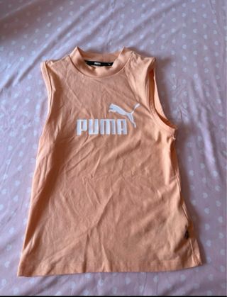 Camiseta deportiva de la marca Puma en color naranja. Ideal para actividades deportivas o para un look casual. - Diseño sin mangas. - Logo de Puma en blanco en el pecho. - Cuello redondo.