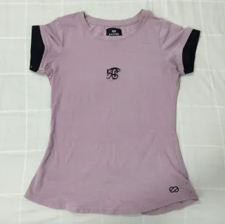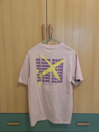Camiseta de manga corta en tono rosa suave. Presenta un pequeño detalle de texto en la parte superior. - Diseño minimalista. - Tejido cómodo.