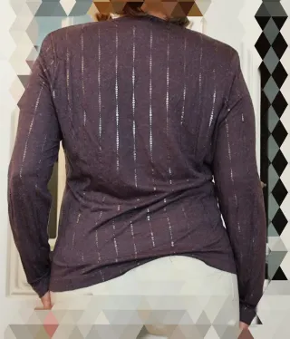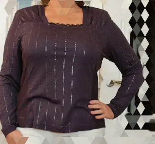 Camiseta de manga larga con un diseño elegante y detalles brillantes. Medidas, 40 cm entre hombros, 50 cm entre axilas y 60 cm de largo - Cuello cuadrado con detalle de encaje. - Rayas verticales con pequeños adornos plateados. - Tejido suave y cómodo.