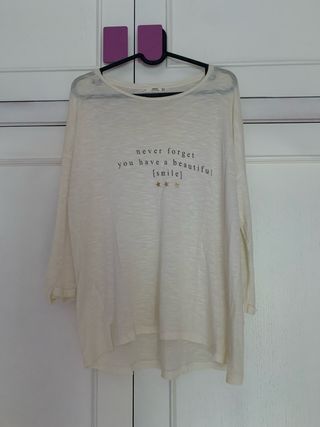 Camiseta de manga larga 3/4. Sin usar. De buena calidad y sin desperfectos. - Diseño con texto never forget you have a beautiful [smile] y estrellas doradas. - Tejido ligero y vaporoso.