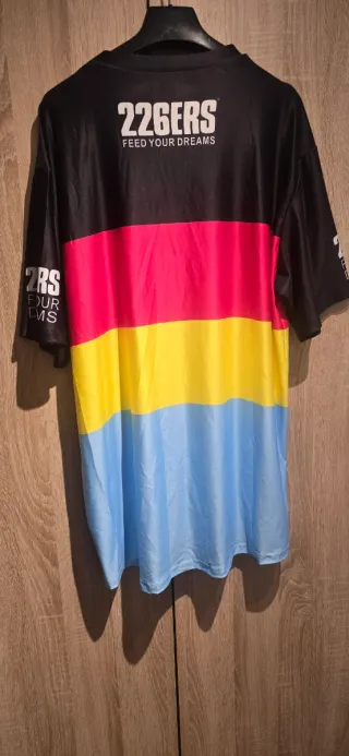 Camiseta técnica de manga corta de la marca 226ERS, ideal para running y entrenamiento. - Diseño con franjas horizontales en negro, rojo, amarillo y azul. - Tejido ligero y transpirable.