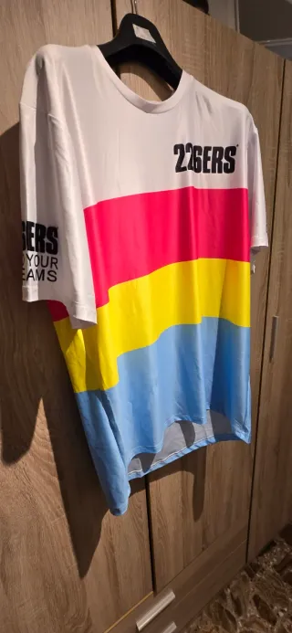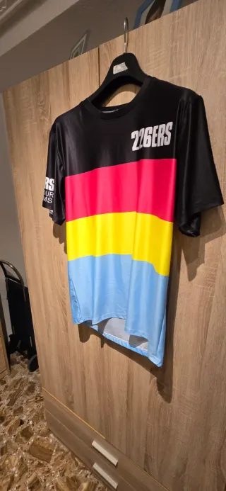 Camiseta de running con un diseño llamativo y colores vibrantes. - Diseño de tres franjas horizontales: roja, amarilla y azul. - Parte superior y mangas en color negro. - Detalle de texto en blanco en la manga izquierda.. Talla grande como una XXL