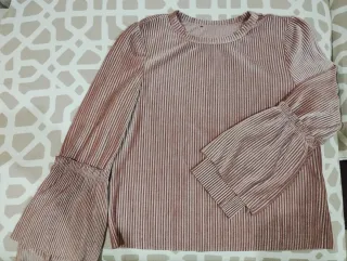 Camiseta recta de terciopelo acanalado (no ciñe). Mangas con un volante. Un solo uso. Color rosa palo. Medidas: De sisa a sisa 46cm y de hombro a cadera 56.5cm.