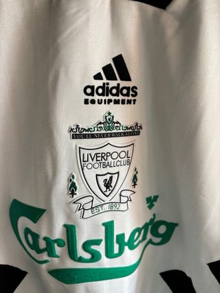 Camiseta de fútbol retro del Liverpool Football Club. - Diseño clásico con detalles icónicos. - Logo de Adidas Equipment. - Escudo del club y patrocinador visible.