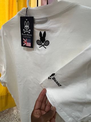 Camiseta de manga corta de la marca Psycho Bunny en color blanco. Presenta un diseño bordado del logo de la marca con dos raquetas de tenis cruzadas en la parte delantera y el nombre de la marca en la manga. - Logo bordado en el pecho. - Logo y nombre de la marca bordados en la manga.