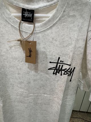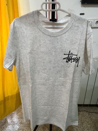 Camiseta de la marca Stüssy con un diseño moderno y llamativo. - Color blanco con estampado jaspeado. - Cuello redondo. - Manga corta.