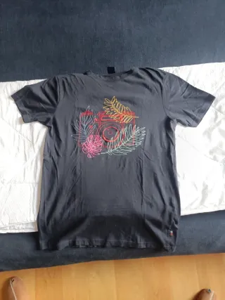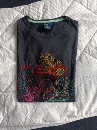 Camiseta de manga corta con un diseño original. - Estampado frontal bordado de cámara con hojas tropicales - Cuello redondo. - Tejido suave y cómodo. 100% algodón
