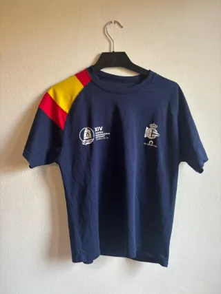 Camiseta tipo deportivo de color azul marino con detalles en los hombros. - Diseño con franjas rojas y amarillas en los hombros. - Estampado frontal con logos. - Cuello redondo.