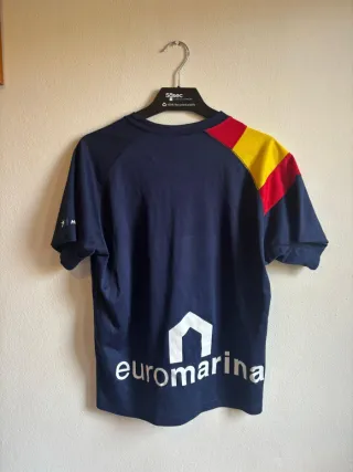 Camiseta de fútbol del Valencia para niño 7años original - Diseño a rayas rojas y amarillas. - Cuello azul. - Logo de Joma en negro.