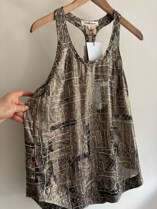 Camiseta de tirantes con un diseño estampado y detalles brillantes. - Estampado geométrico. - Acabado metálico dorado y marrón. - Detalles de pedrería.